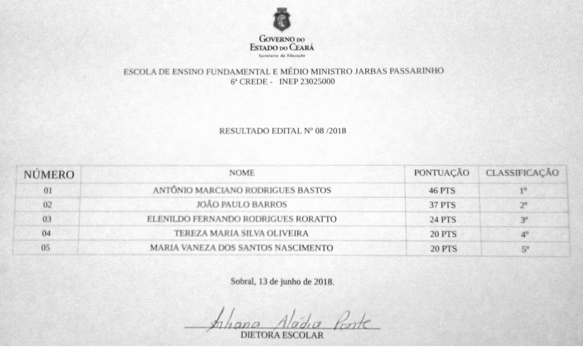 RESUTADO DO EDITAL Nº 08/2018 – GAB/CREDE 6 – EEM MINISTRO JARBAS PASSARINHO