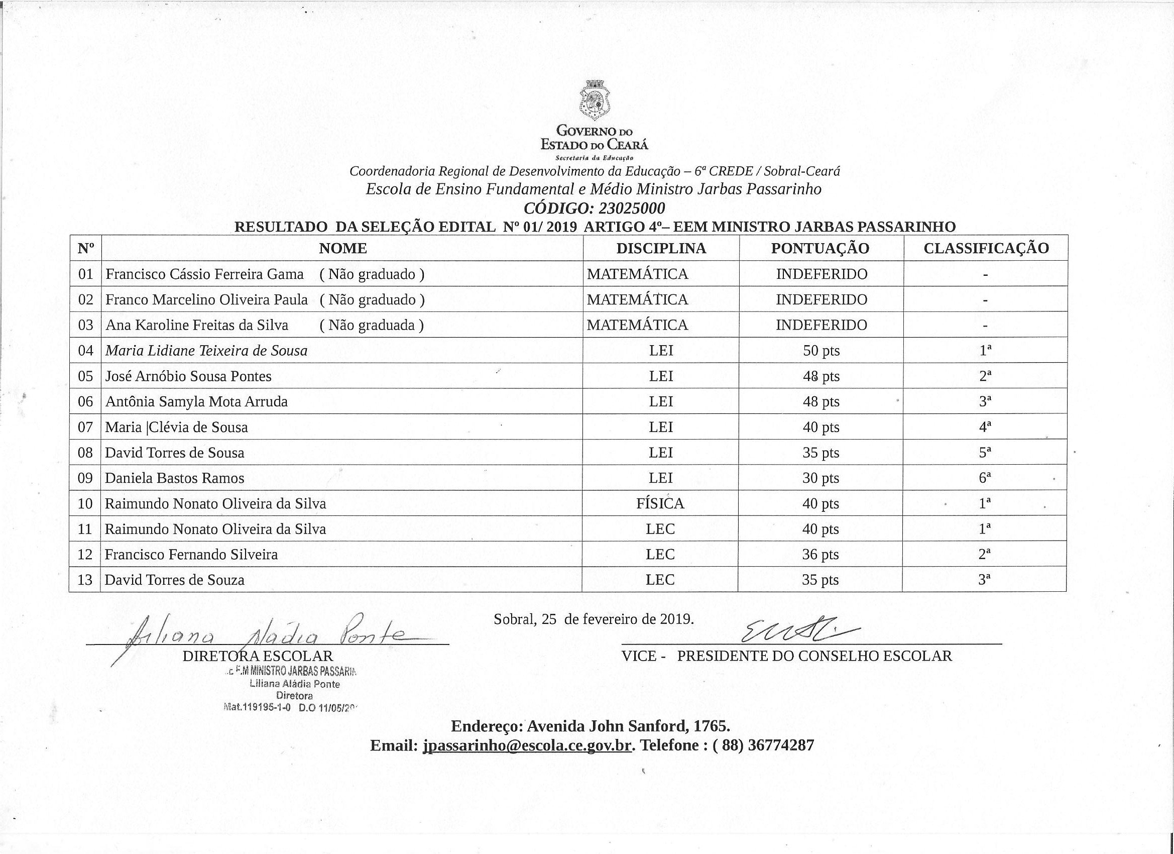 RESUTADO DO EDITAL Nº 01/2019 – CREDE 6 – EEM MINISTRO JARBAS PASSARINHO