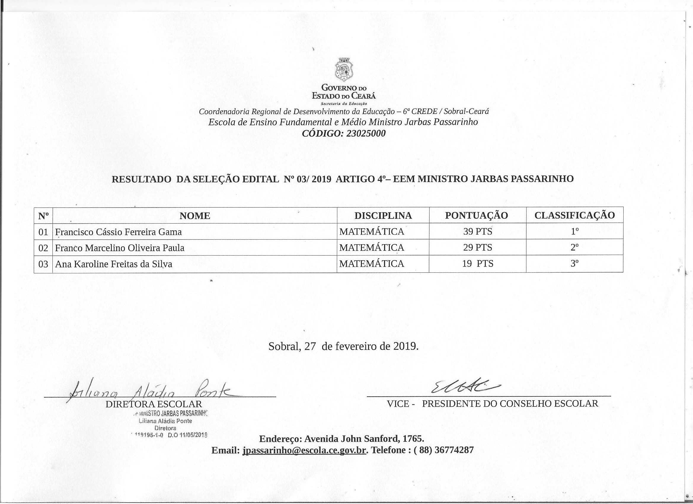 RESUTADO DO EDITAL Nº 03/2019 – CREDE 6 – EEM MINISTRO JARBAS PASSARINHO