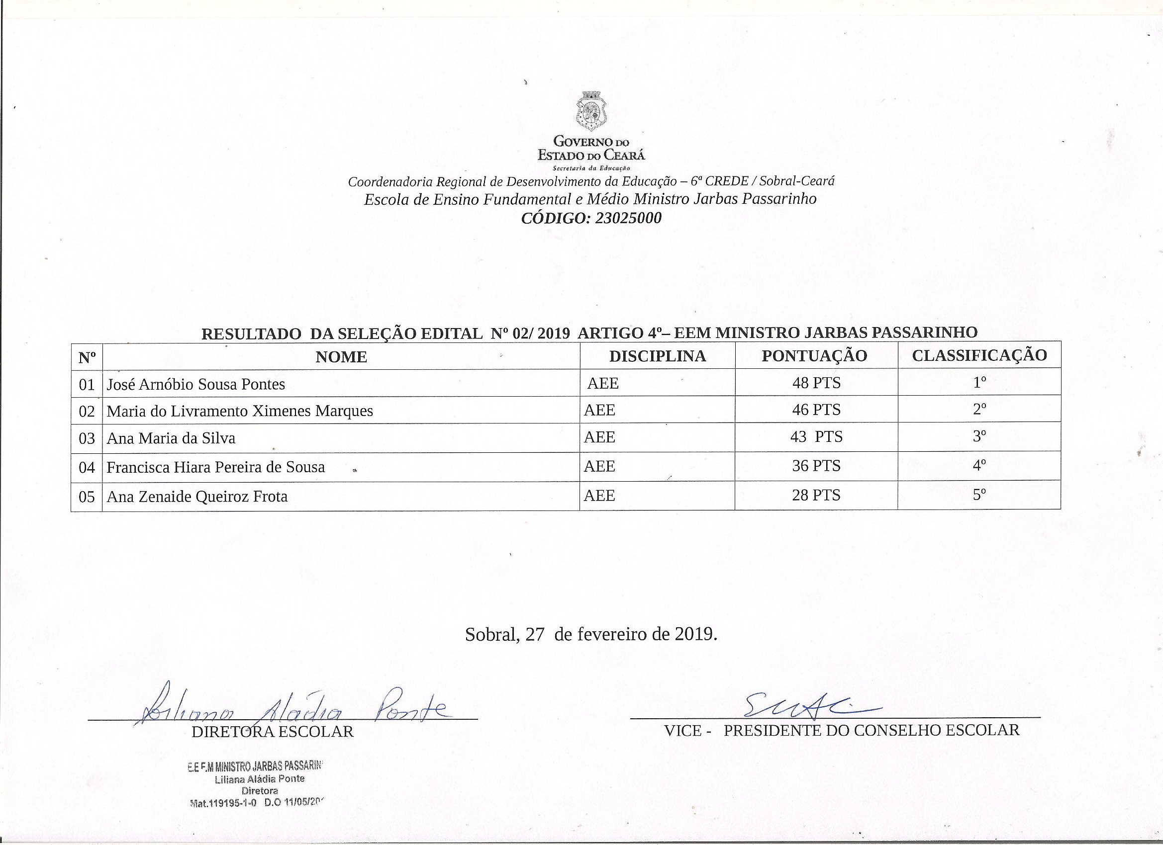 RESULTADO EDITAL Nº 02/2019-CREDE 6 SOBRAL-CE-Art 4-EEM JARBAS