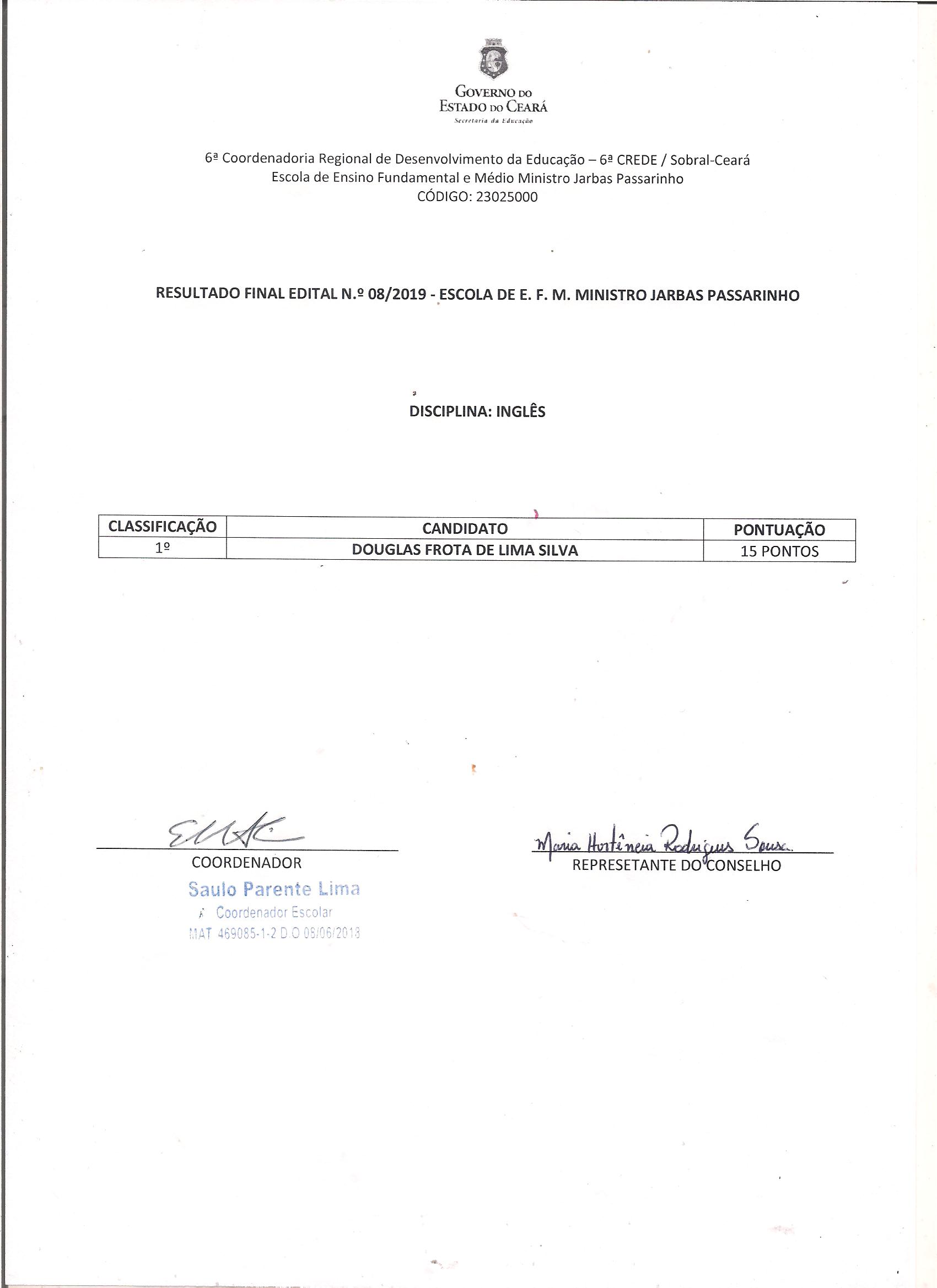 RESULTADO FINAL EDITAL Nº 08/2019 – GAB/CREDE 6 – EEM MINISTRO JARBAS PASSARINHO