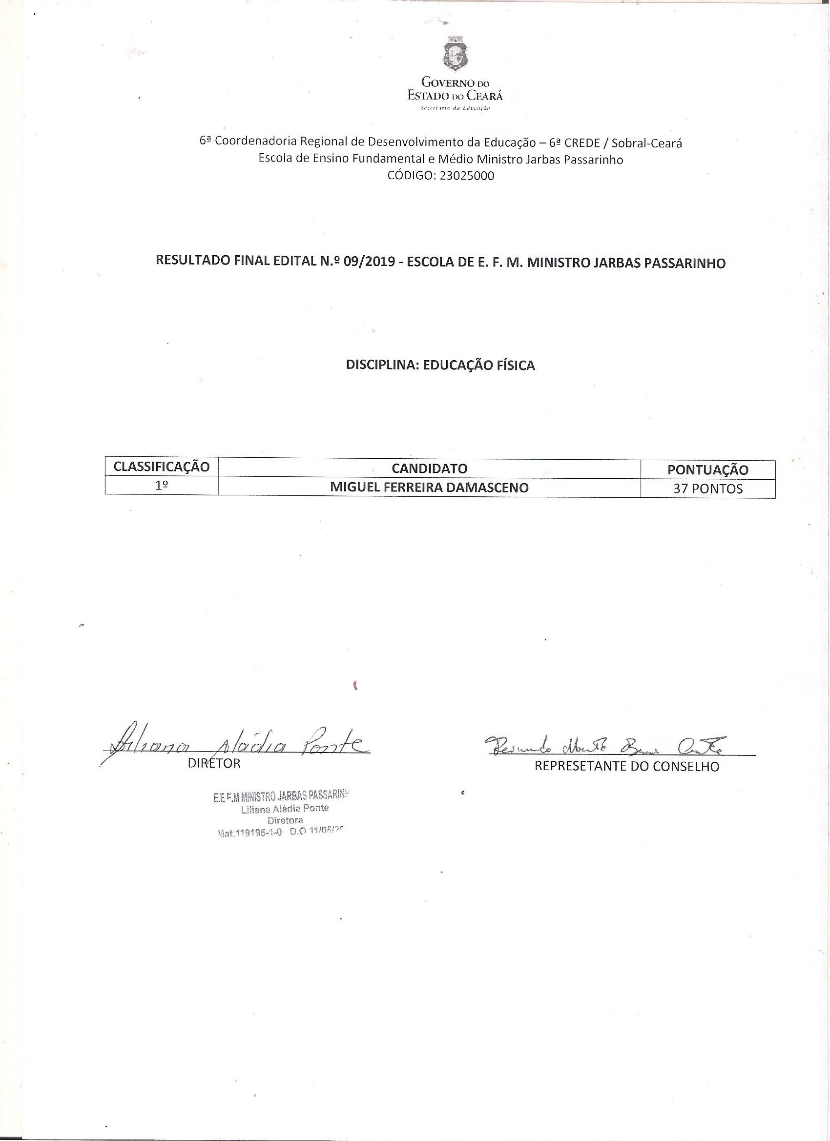 RESULTADO EDITAL Nº 09/2019-GAB/CREDE 6 SOBRAL-CE-Art 4-EEM JARBAS