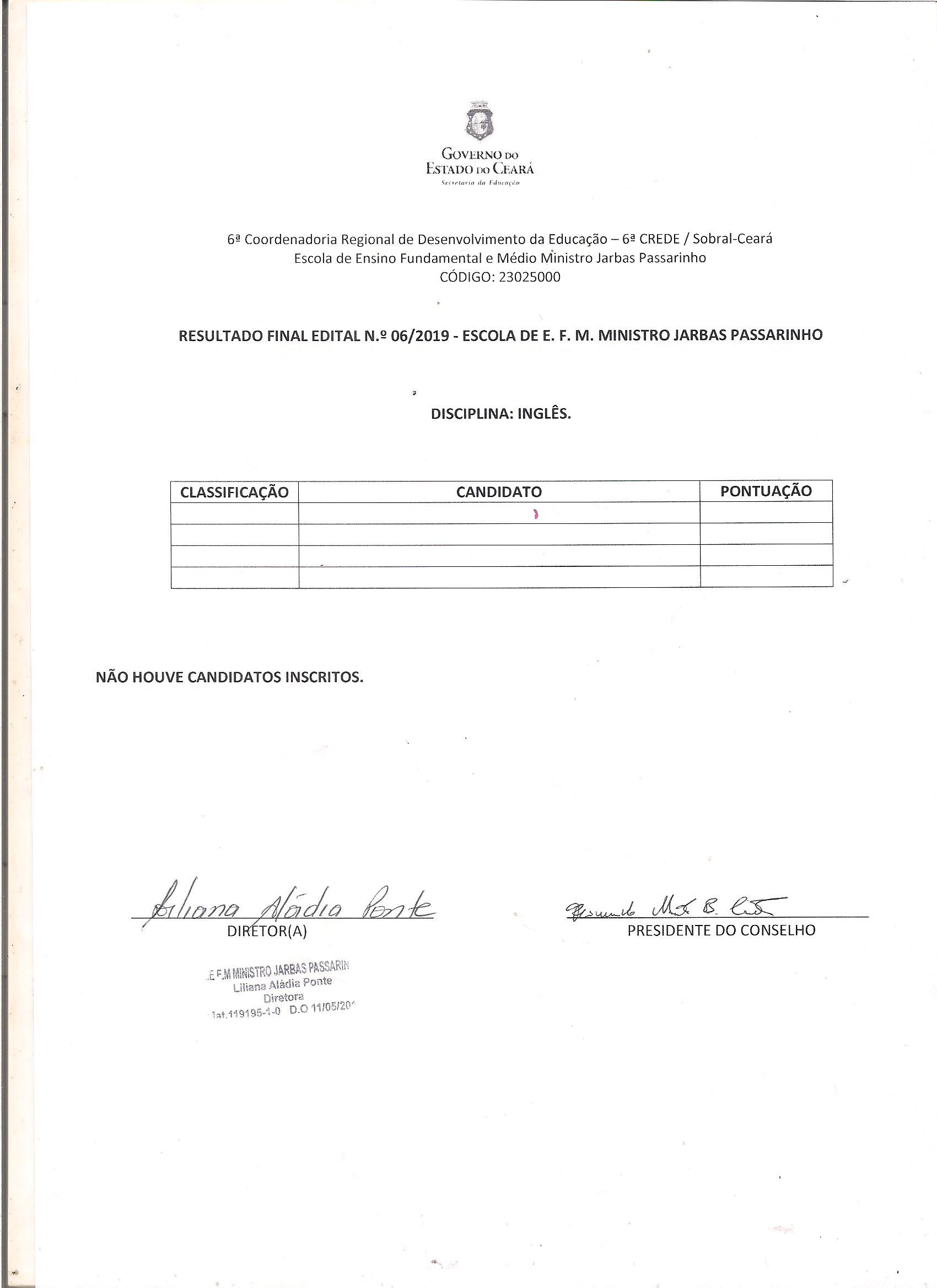 RESUTADO DO EDITAL Nº 06/2019 – CREDE 6 – EEM MINISTRO JARBAS PASSARINHO
